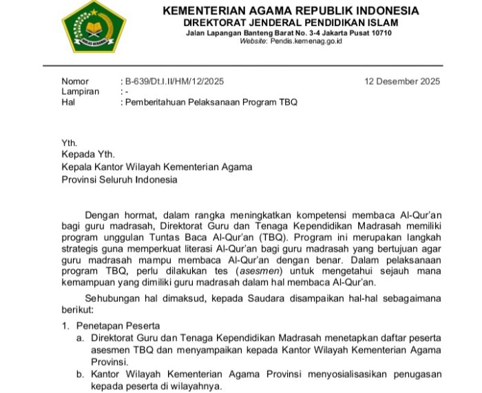 Betung ( MTsN 5 Muaro Jambi ) Kementerian Agama Republik Indonesia resmi meluncurkan Program Tuntas Baca al-Quran atau TBQ. Surat tersebut di tujukan kepada seluruh Kepala Kantor Kementerian Agama...